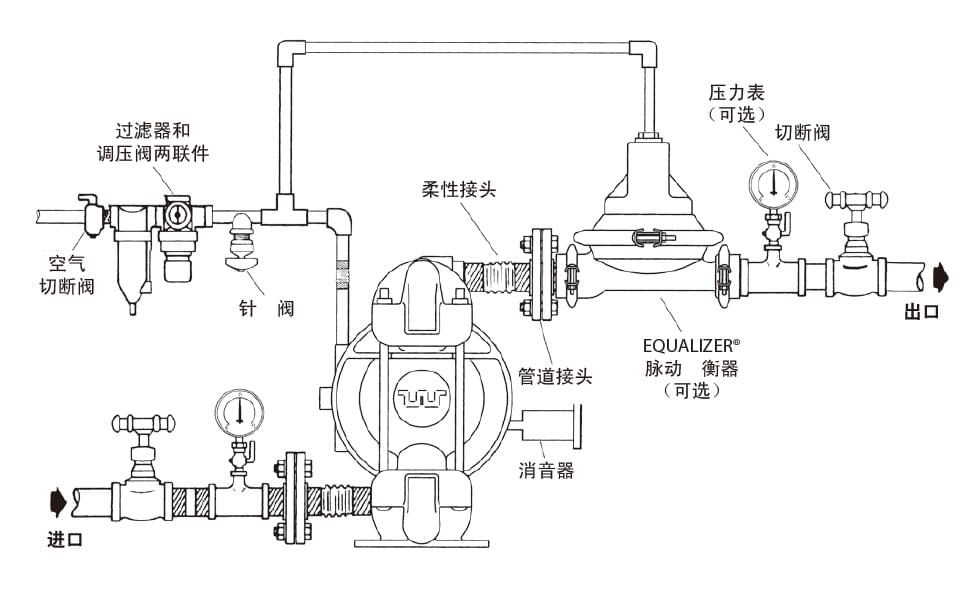 將泵安裝在平整臺面上,底腳固定,接上物料進(jìn)出管道(物料進(jìn)出口處的建議:安裝30-50CM長彈性軟管(或撓性接頭)以保護(hù)泵,降低、減少震動,避免螺栓松動,造成滲漏),緊固隔膜泵上所有螺絲(防止運(yùn)輸搬動途中造成螺栓松動),接上氣源即可。